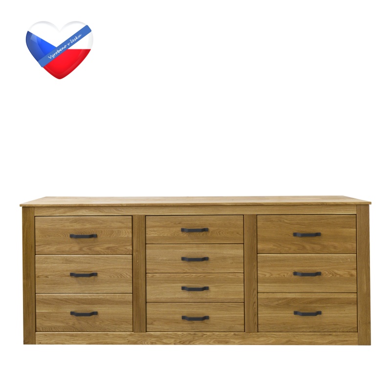 Dubová komoda je nejen stylová, ale také praktická. Velká vrchní odkládací plocha je ideální pro umístění dekorací, fotografií nebo jiných věcí, zatímco spousta úložného prostoru ve formě 10ti šuplíků nabízí dostatek místa pro uložení všeho potřebného.