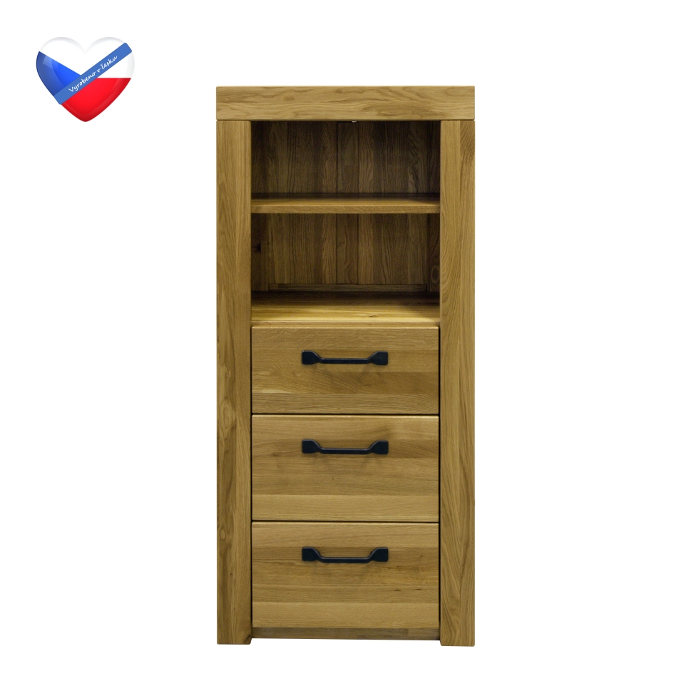 Komoda Karolis má pevné masivní boky. 3 hluboké šuplíky a jednu polici, která je výškově nastavitelná. Šuplíky a dvířka mají kvalitní kování s tlumeným dojezdem. Povrch je ošetřen několika vrstvami bezbarvého oleje.