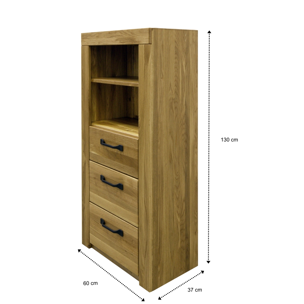 Komoda Karolis má pevné masivní boky. 3 hluboké šuplíky a jednu polici, která je výškově nastavitelná. Šuplíky a dvířka mají kvalitní kování s tlumeným dojezdem. Povrch je ošetřen několika vrstvami bezbarvého oleje.   Vlastnosti produktu: 100% dub 3 šuplíky 1 police výškově nastavitelná kování s tl... celý popis