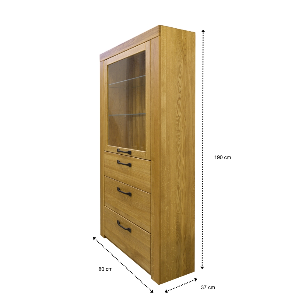 Vitrína Karolis má pevné masivní boky a tři hluboké šuplíky. Horní prostorná část má skleněné police a prosklené dvířka, takže na Vaše vystavené kousky bude dobře vidět. Prosklené police jsou výškově nastavitelné. Šuplíky a dvířka mají kvalitní kování s tlumeným dojezdem. Povrch je ošetřen několika vrstvami bezbarvého oleje.